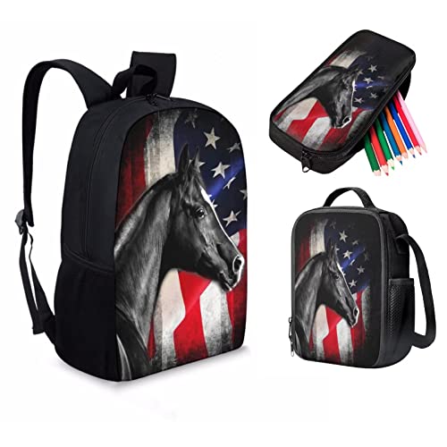 AFPANQZ American Flag Horse School Backpack with Insulated Lunch Tote with Shoulder Strap Handle Zipper Small Pencil Case Pouch Storage Bag 3 Pieces Set for Kids Child